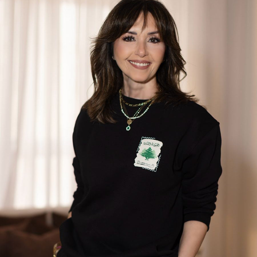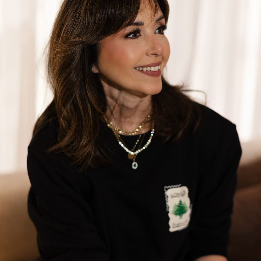 Tailored black pants with pins meet a black sweater stamped with Lebanon’s cedar, creating a sleek, modern silhouette. Pointed black ankle elevate the look, blending elegance with subtle cultural detail — perfect for confident, city-ready style.
